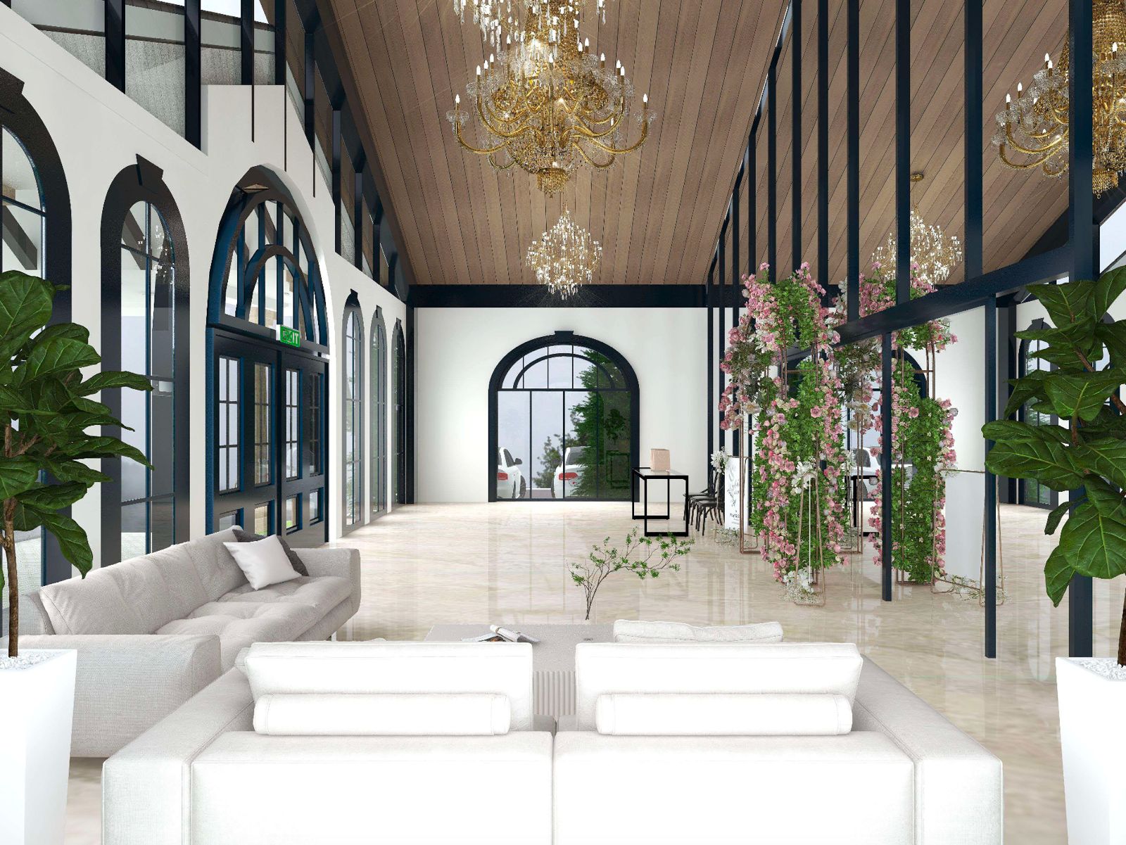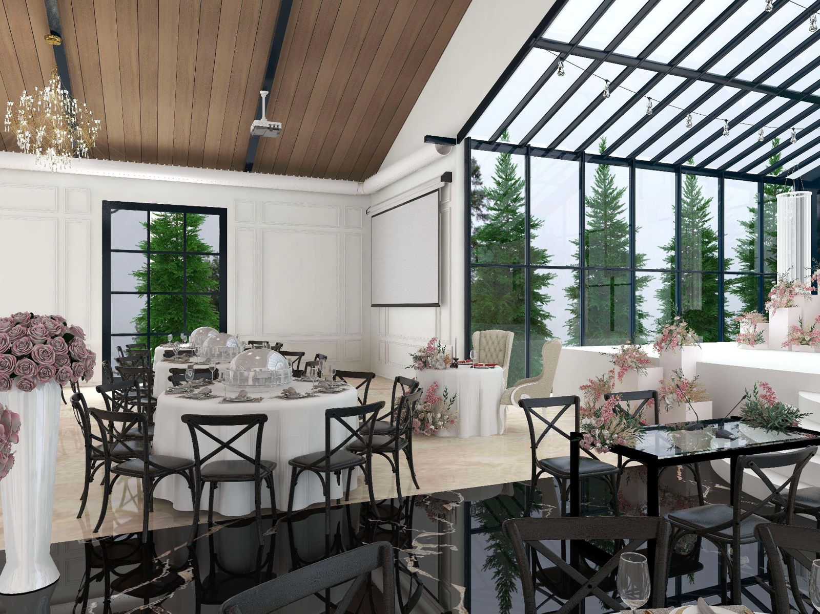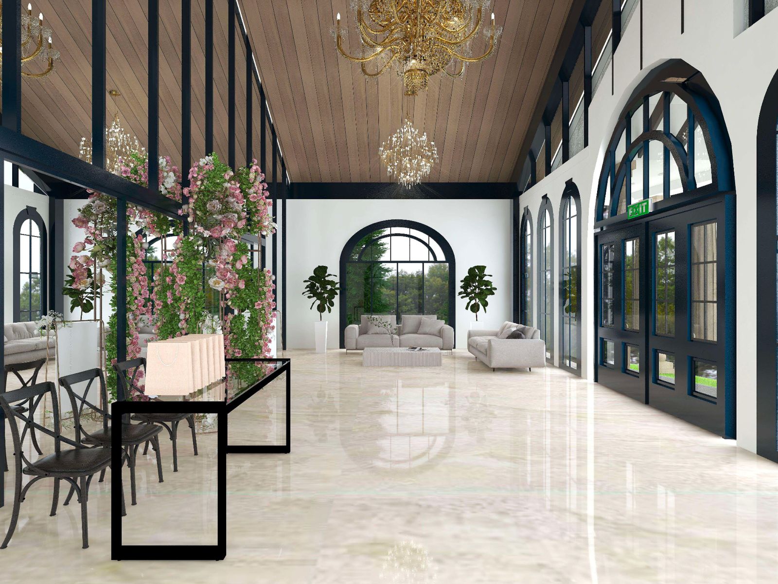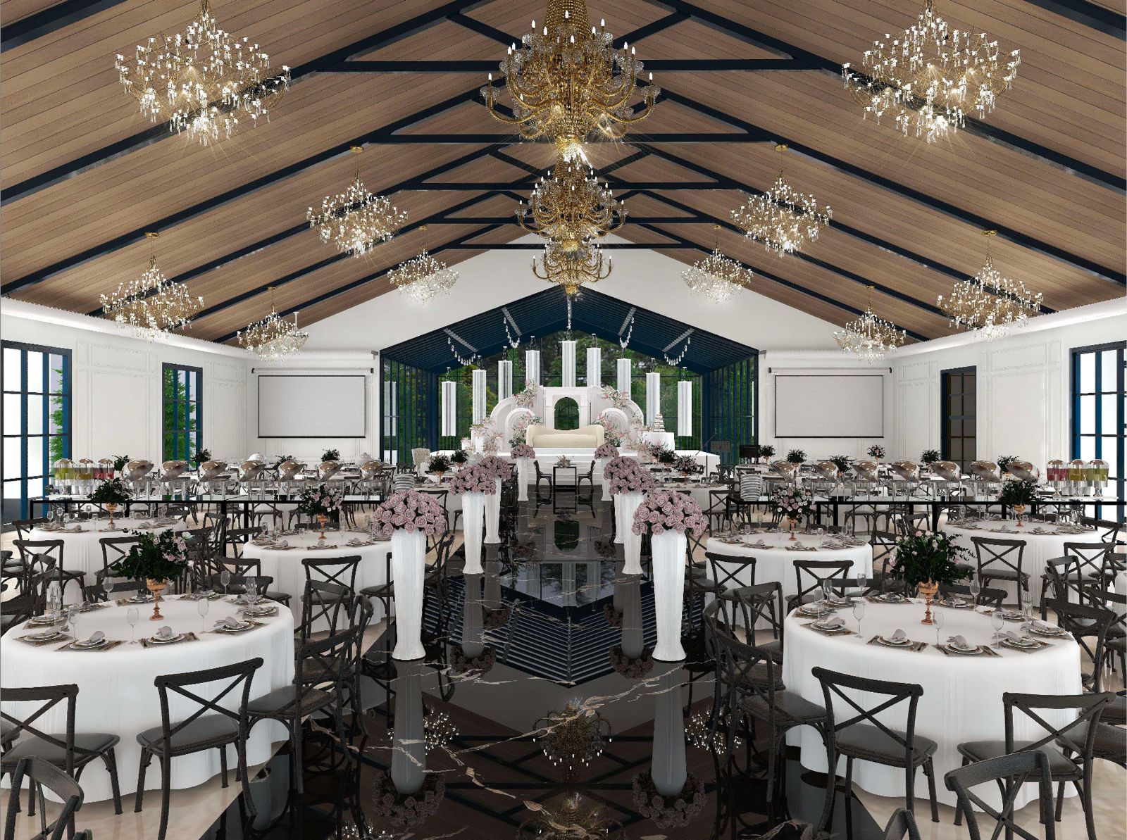A lovely pillar-less event hall that is suitable for wedding reception and such. A large, airy feeling with glass walls and floors. Food is exceptional!