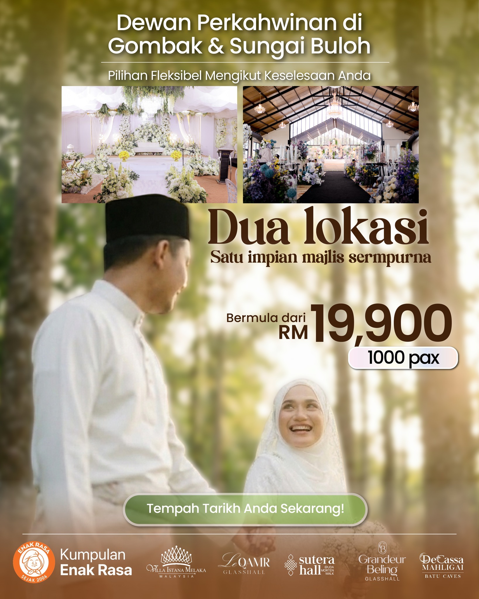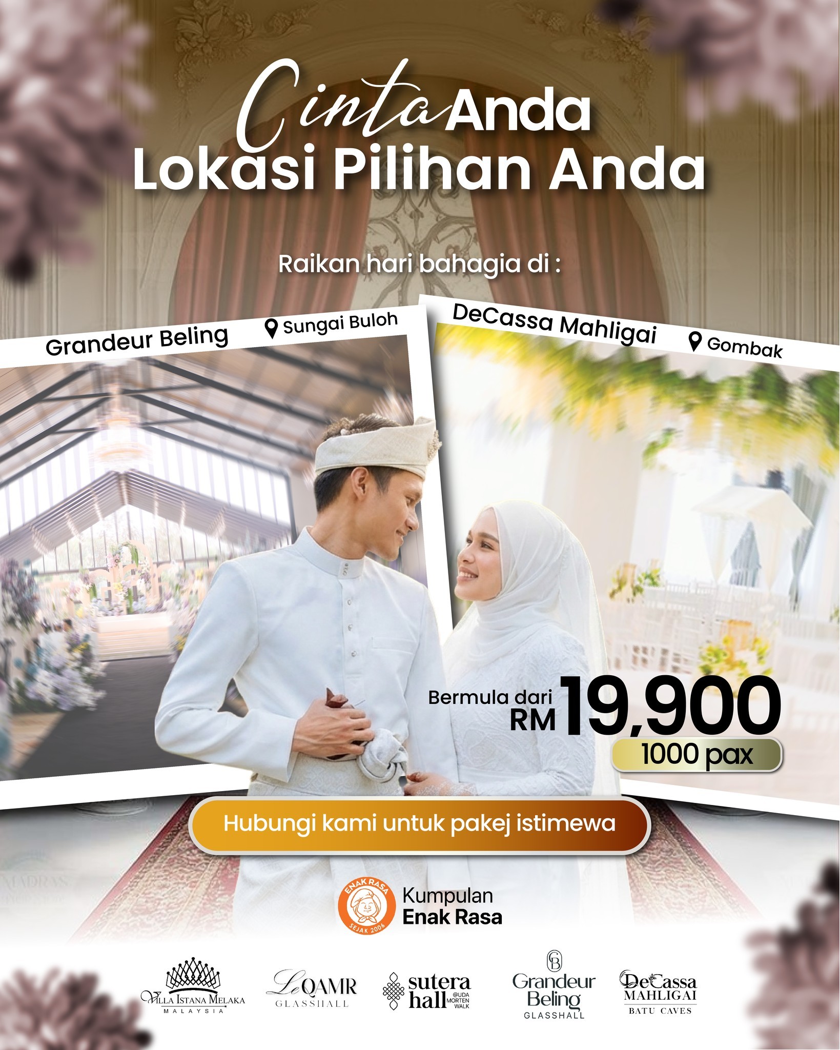 Raikan cinta abadi anda tanpa sebarang kerumitan. Pakej perkahwinan lengkap Kumpulan Enak Rasa menawarkan dekorasi memukau, katering lazat, dan perancangan teliti untuk merealisasikan majlis impian anda.